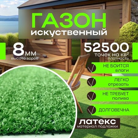 Искусственная трава в рулоне , высота ворса 8 мм подойдет для сада, дачи и частного дома. Искусственная зелень для декора отлично дополнит интерьер вашей квартиры или балкона. Если у Вас есть дети, то можно оформить искусственным газоном детскую площадку. Покрытие искусственной травой безопасно для детей и животных, на нем можно не только поиграть в подвижные игры, но и позагорать. Искусственная трава подходит для благоустройства захоронений, могил и для оформления межгрядочного пространства на дачном участке. Декоративная трава препятствует росту сорняков и проста в уходе. Не нужно стричь и поливать. Искусственный газон долго служит, устойчив к механическим повреждениям и солнечным лучам, не выгорает на солнце и не подвергается изменениям при перепадах температур. При первом использовании газон может осыпаться по краям. Рекомендуется расстелить газон и дать ему отлежаться.