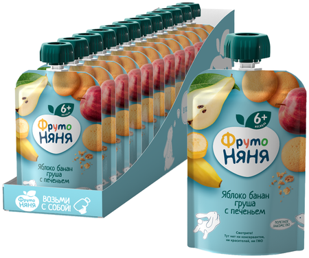Фруктовое пюре в мягкой упаковке «ФрутоНяня» — это вкусный и полезный перекус, который удобно брать с собой, а яркая мягкая упаковка привлечёт внимание Вашего малыша и позволит ему есть самостоятельно. В этом пюре только нежные бананы, спелые груши, отборные яблоки и специальное детское печенье, чтобы малышу было полезно и вкусно.
