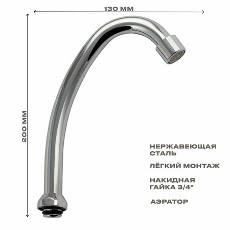 Излив к смесителю из нержавеющей стали на кухню или раковину С-образный высокий предназначен для подачи воды, поступающей из смесителя. Гусак имеет удобную конфигурацию и отлично подходит для кухонного смесителя. Высокий С-образный излив обеспечит мощный поток воды. Универсальный излив для смесителя изготовлен из нержавеющей стали и имеет хромированное покрытие. Идеально впишется в любой дизайн и может использоваться повсеместно. Устройство оснащено аэратором, проходя через него, вода насыщается множеством пузырьков воздуха, позволяя формировать струю в мягкий и ровный поток, а также экономить расход воды. Габаритные размеры: длина 130 мм, высота 200 мм.