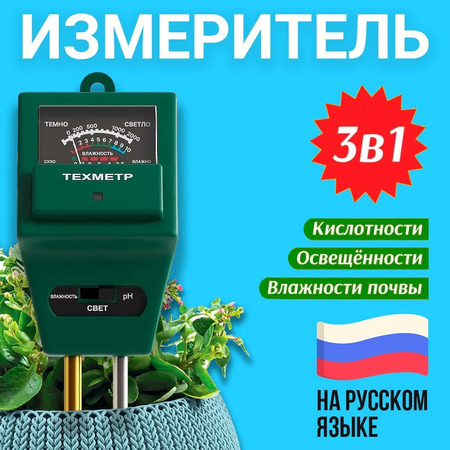 Этот компактный прибор станет настоящей находкой для цветоводов, садоводов, дачников, выращивающих овощи, фрукты и ягоды в домашних условиях, а также устройство может использоваться для профессионального растениеводства, например, в теплицах, на полях, бахче и т. д. Девайс отличается компактностью, функциональностью и простым управлением, что позволяет с комфортом использовать его даже людям, неуверенно обращающимся с техникой, например, пожилым людям. Функциональные возможности девайса Этот датчик позволяет выполнять сразу три важные функции: во-первых, измерять уровень влажности в почве, во-вторых, определять уровень кислотности земли, то есть pH, в третьих, он имеет дополнительный датчик света и может показать, в достаточном, недостаточном или избыточном количестве растение получает свет. Устройство будет полезно в том случае, если вы: стремитесь вырастить сложное растение, нуждающееся в особом уходе; хотите создать максимально комфортные условия для их роста и развития; профессионально занимаетесь растениеводством и получаете прибыль за выращивание рассады, снятие и реализацию урожая и т. д. Почему стоит купить этот девайс Данный измеритель позволяет определять три важнейших показателя условий жизни растений: кислотность и влажность почвы, а также количество получаемого света. Прибор работает в широком диапазоне температур, поэтому он может применяться как в закрытых помещениях например, в теплице или дома, в цветочном горшке, так и на улице, в открытой почве. Для того чтобы получить результаты измерения, достаточно воткнуть прибор в почву и подождать несколько минут до появления результата. Прибор может использоваться разово или постоянно находиться в почве. Размеры устройства компактны, его габариты составляют 290х49х35 мм. Шкала для считывания невероятно проста. У устройства есть лишь одна физическая кнопка-переключатель, позволяющая отследить информацию по трем разным показателям. Управление интуитивно понятно, для обращения с прибором не требуется даже инструкция, что делает его особенно удобным и простым.
