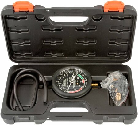 Применяется для измерения разряжения во впускных коллекторах и связанных с ними вакуумных магистралях двигателей внутреннего сгорания. Может применяться для измерения давления топлива, создаваемого электрическими и механическими топливными насосами. Состоит из большого манометра с легко читаемой шкалой, измеряющего как давление до 0,7 кгс/см2, так и разряжение до 700 mm Hg. Набор укомплектован резиновым шлангом и комплектом необходимых переходников. Поставляется в индивидуальном пластиковом кейсе.