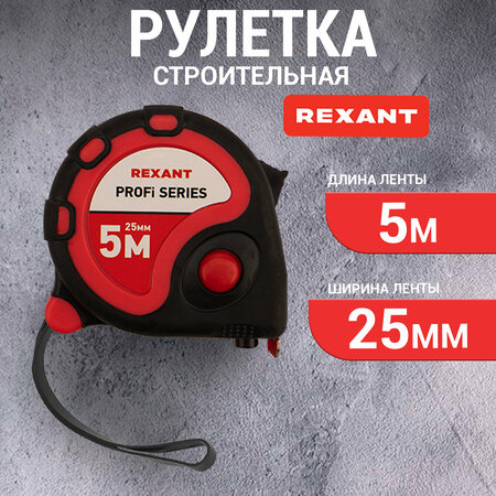 Измерительная рулетка REXANT Профи необходима при проведении измерительных работ в строительстве, хозяйстве, ландшафтных и геодезических исследованиях. Двухкомпонентный прорезиненный корпус, выполненный из ударопрочного пластика, не скользит в руках. Прочное полотно без изломов имеет глянцевое покрытие. Для удобства использования предусмотрены кнопки стопора и фиксации тормоза. Инструмент оснащен удобным зацепом с отверстием посередине, которое позволяет зафиксировать полотно рулетки на шляпке гвоздя или самореза. На корпусе расположена клипса-зажим для фиксации рулетки на ремне, кармане или поясной сумке. Ремешок позволяет надевать инструмент на запястье, чтобы освободить руки для работы.