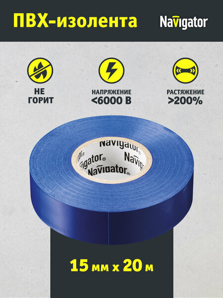 Изолента общего применения 0,13 × 15 мм Электроизоляционная лента Navigator серии NIT на ПВХ основе предназначена для изоляции, соединения, цветной маркировки и защиты от повреждений проводов и кабелей. -Соответствует требованиям ГОСТ 16214-86 -Не поддерживает горение! -Электрическая прочность (напряжение пробоя) – 6000 В -Липкость ленты – 400 с -Относительное удлинение при разрыве – 200% -Температура хрупкости – -50°С - Рабочая температура – от -50 до +80°С