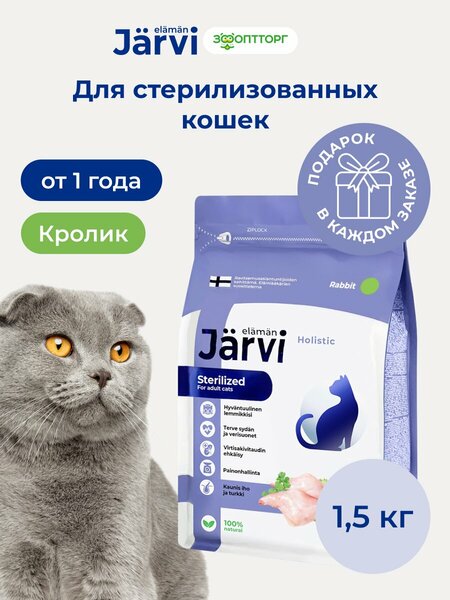 Корм для кошек сухой, разработанный ветеринарами-нутрициологами бренда Jarvi, содержит все необходимые микроэлементы и витамины для здоровья Вашего питомца. Кошачий корм тщательно проверяется в лаборатории на соответствие высоким стандартам финского качества. Компания применяет современные технологии и использует для производства рациона только натуральные ингредиенты, свежее мясо и исключает искусственные красители и консерванты. В наших кормах за основу взята холистик рецептура, которая обеспечит Вашего хищника запасом энергии, исходя из его потребностей, как если бы он жил в дикой природе. В сухом корме для кошек стерилизованных Jarvi: • два вида мяса – кролик, курица; • клюква – для профилактики мочекаменной болезни; • здоровое сердце и поддержание веса – таурин помогает поддерживать здоровье сердечно-сосудистой системы и оптимальную активность кастрированного питомца; • витаминно-минеральный комплекс – для здоровой кожи, блестящей шерсти и крепкого иммунитета. Полнорационный сухой корм для кошек – это питание на каждый день, больше нет необходимости давать дополнительные витамины. Корм для кошек сухой стерилизованных подойдет для здоровых питомцев, нуждающихся в профилактике мочекаменной болезни. Клюква в составе помогает предотвратить инфекции мочевыводящих путей и защищает самые уязвимые органы у кошек и котов после стерилизации и кастрации. Мы добавили в корм сухой для кошек пребиотики и пробиотики – они обеспечивают хорошую усвояемость, поддерживают пищеварение на протяжении всей жизни и помогают быстро адаптироваться к новому корму. При переходе очень важно начинать с небольших порций нового корма, смешивая его со старым, это поможет избежать возможных нежелательных реакций ЖКТ. Благодаря оптимальному размеру крокетов корм Jarvi (Ярви) подходит для кошек всех пород. Им можно кормить британских, шотландских, бенгальских, персидских, сфинксов, мейн кунов и других кошек и котов.