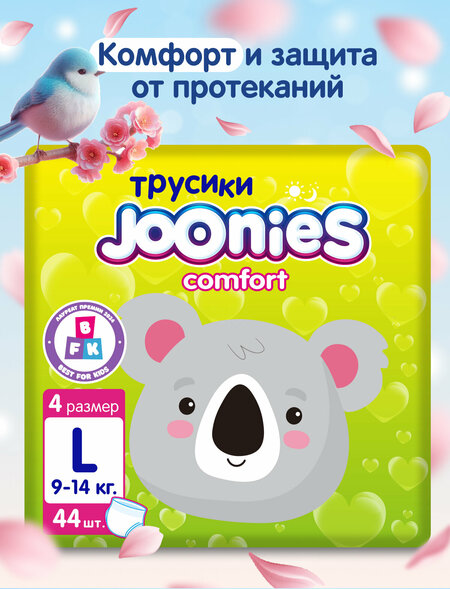 Подгузники-трусики JOONIES Comfort, размер L (9-14 кг) - это удобные и функциональные подгузники, предназначенные для детей с весом от 9 до 14 кг. Каждая упаковка содержит 44 шт подгузников-трусиков. JOONIES Comfort разработаны с учетом комфорта и удобства использования. Они имеют форму трусиков, что делает их легкими в надевании и снятии, особенно для активных малышей. Подгузники-трусики JOONIES Comfort размера L имеют эластичный пояс и мягкие манжеты, обеспечивающие хорошую посадку и комфорт. Они обладают высокой прочностью и эластичностью, чтобы поддерживать активные движения вашего ребенка. JOONIES Comfort также имеют поглощающий слой, который быстро впитывает влагу и предотвращает протекания. Они обеспечивают длительную сухость и защиту от протеканий в течение дня и ночи. Удобная система закрепления на боковых панелях делает использование подгузников-трусиков JOONIES Comfort простым и позволяет легко регулировать посадку для достижения оптимального комфорта и защиты. Подгузники-трусики JOONIES Comfort размера L (9-14 кг) обеспечивают надежную защиту и комфорт для вашего ребенка, позволяя ему свободно двигаться и исследовать мир вокруг. Рекомендуется периодически менять подгузники-трусики, чтобы поддерживать чистоту и комфорт вашего ребенка. Подгузники-трусики JOONIES Comfort размера L (9-14 кг) - это отличный выбор для детей в этом весовом диапазоне, обеспечивающий надежную защиту и комфорт в течение всего дня.