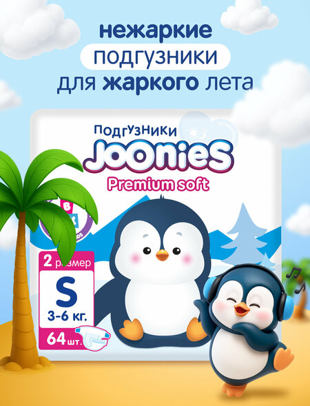 JOONIES Premium Soft Подгузники, размер S (3-6 кг), 64 шт.