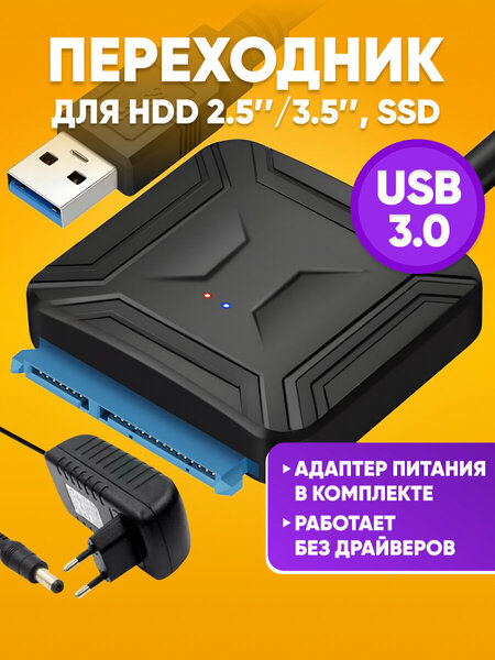 Адаптер для подключения жестких дисков к компьютеру через USB разъем. Особенности: Адаптер позволяет подключать как маленькие накопители (SSD или HDD 2.5 от ноутбуков), так и большие HDD 3.5. В комплекте идет адаптер питания, который подключается в розетку. Он нужен, если вы подключаете HDD 3.5 или дисковод. USB 3.0 интерфейс для повышенной скорости передачи данных. Жесткий диск будет определяться, как флешка. Характеристики: Поддержка ОС: Windows 98/2000/XP/Vista/Windows 7/8 и выше, Mac OS и выше Поддержка скорости до 5 Гбит/с Обратная совместимость с USB 2,0/1,1 Поддержка всех 2,5 "/3,5" SATA HDD/SDD