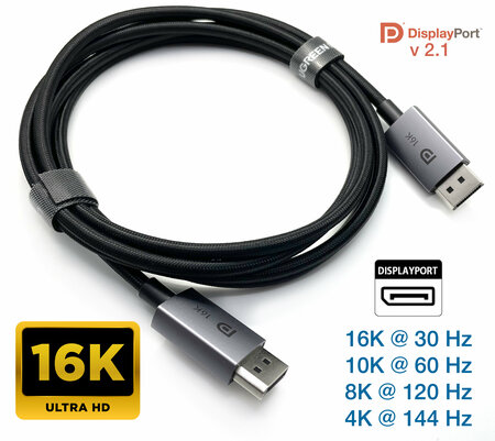 Кабель UGREEN DisplayPort - DisplayPort Premium Smart Digital DP 16K выполнен в этетическом внешнем виде, в нейлоновой оплетке, с защитой от сгибов на разъемах, сами разъемы выполнены из надежного металичесского сплава, который гарантирует высокую надежность и проводимость без потерь. Версия: 2.1 Максимально поддерживаемое разрешение: 16K (15360×8640) Длина: 2 метра Поддержка Dynamic HDR Поддежка мультиканального аудио Поддерживаемые разрешения: 16K (15360×8640) 30 Hz, 10K (10240 × 4320) 60 Hz, 8K (7680×2160) 120 Hz, 6K (5760 × 3240), 5K (5120 × 1440), 4K (3840×2160) @ 240 Hz, 144 Hz, 120 Hz