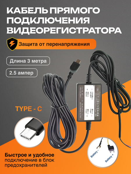 Автомобильное зарядное устройство для скрытой проводки от блока предохранителей, специально разработанное для безупречной работоспособности ваших устройств, таких как видеорегистраторы, навигаторы, камеры и другие устройства, с разъемом Type-C и другими (можно использовать переходник). Изготовленное из высококачественных материалов, соответствующих строгим европейским стандартам качества, это устройство гарантирует долгий срок службы. Длина кабеля составляет 3,5 метра, что обеспечивает удобство при установке и скрытой проводке от автомобильного аккумулятора. Сила тока на выходе составляет DC 5V/2.5А, что способствует более быстрой зарядке ваших устройств. Благодаря этому, вы всегда будете уверены в стабильной работе своих устройств Это устройство идеально подходит для большинства видеорегистраторов и навигаторов со стандартной распайкой по питанию. Благодаря высокому качеству изготовления и точному соответствию стандартам, вы можете быть уверены в стабильной работе своих устройств. Автомобильное зарядное устройство для скрытой проводки от АКБ имеет входное напряжение устройства поддерживает диапазон 12-24 В, что делает его универсальным для использования как в легковых, так и в грузовых автомобилях. Выходное напряжение составляет 5 В, а выходной ток 2.5 А – оптимальные параметры для эффективной зарядки ваших устройств и поддержания их работоспособности в дороге. Выбирая наше Автомобильное зарядное устройство для скрытой проводки от АКБ, вы получаете надежный и удобный способ обеспечить вашим устройствам безопасную и стабильную работу Кабель прямого подключения видеорегистратора имеет встроенный предохранитель. Для обеспечения наиболее высокой безопасности цепи, или если в вашем блоке предохранителей используется разъем отличный от MINI, рекомендуем использовать разветвитель предохранителя. Вы можете найти подходящий: арт. 1583363421 В комплект не входит разветвитель предохранителя.