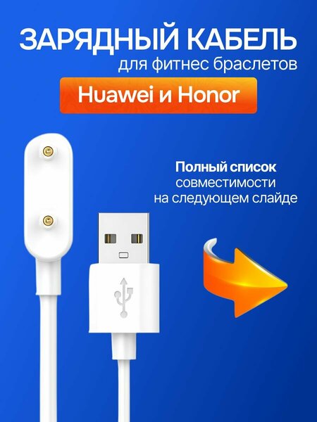Зарядка полностью совместима с моделями: - Huawei Watch Fit / Fit 2 / Fit 3 / New / Mini / Special Edition - Huawei Kid Watch 4X / 4 Pro / 5X / 5 Pro - Huawei Band 6 / 6 Pro / 7 / 8 / 9 / 10 - Honor Band 6 / 7 / 9 / 10 / Fit - Honor Watch ES / Choice - Honor Rossini 2e / 2i К другим моделям - не подойдёт USB кабель на магнитах для фитнес браслета и смарт-часов Honor и Huawei. Usb провод имеет высокие характеристики эксплуатации. Уведомляем, что магниты слабее, как и у любого другого продавца, чем у оригинальных проводов от Huawei / Honor, но на качество работы это не влияет и наш кабель очень надежный и долговечный, не сомневайтесь. Usb провод питания для фитнес-браслетов и смарт-часов выполнен из высококачественных материалов, повышающих срок эксплуатации изделия без потери качества заряда. Магнитные коннекторы 2pin крепко магнитятся, даже при движении провода, длиною 1 метр, аксессуар для заряжания не теряет контакта с электронным прибором. Магнитный шнур для зарядки имеет ещё одно важное достоинство, выделяющее его среди внешне похожих моделей: наш магнитный провод имеет встроенный смарт-чип, который обеспечивает полную защиту аккумулятора устройства от перегрузки и перезарядки. Чтобы сетевое зарядное устройство служило долго – не скручивайте провод в тугое кольцо и не мочите. Успейте купить кабель для зарядного устройства этой модели, а лучше приобретите сразу два или три таких важных аксессуара: один для офиса, второй для машины, третий для дома. Компактный и лёгкий провод подойдет и для путешествия. Быстрая зарядка от нашего бренда - это выгодное предложение. Если у Вас устройство иной модели, перейдите в наш магазин и обратите внимание на другие не менее качественные зарядки.