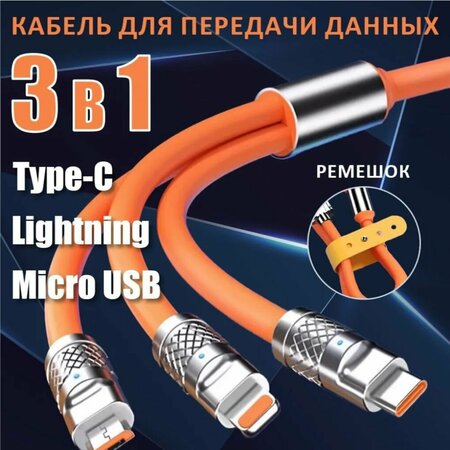 Кабель для быстрой зарядки 3 в 1 мощностью 120 Вт, 6 А в надежной прочной силиконовой оплетке. Провод для зарядки c разъемами Apple Lightning, USB Type C и micro USB. Тройной провод в прочной силиконовой оплетке, подходит в качестве кабеля зарядки. Для корректной работы Ваших устройств необходим смартфон с функцией быстрой зарядки и мощный сетевой блок 4- 5А. Провод длиной 2 метра позволяет комфортно пользоваться им.