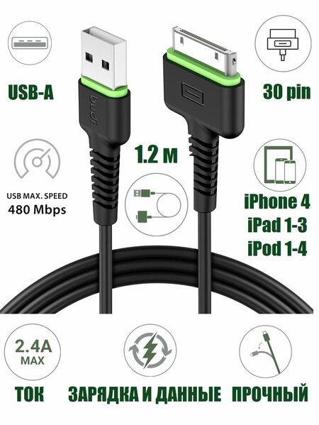 Кабель USB 30 pin для iPad 1 / 2 / 3, iPhone 4 / 4S, iPod 1 / 2 / 3, 1,2 м, для айфон 4 Кабель USB 30 pin представляет собой надежное устройство для зарядки, синхронизации и передачи данных для гаджетов фирмы Apple, которые оснащены разъемом 30 pin. Длина кабеля составляет 1,2 метра, что обеспечивает удобство использования. Коннекторы выполнены по технологии "рыбий хвост" и продлевают срок жизни, гарантируя до 10000 сгибаний без повреждения. Совместимость с различными моделями гаджетов Apple: iPhone 4/4s, iPhone 3G/3GS, iPad 1/2/3, iPod1/2/3/4. Все разъемы кабеля выполнены в виде USB 2.0 (am) и Apple 30 pin, что обеспечивает надежное и быстрое подключение к различным устройствам. Максимальный ток составляет 2.0 А, что позволяет быстро и безопасно заряжать устройства. Среда эксплуатации: внутреннее использование (для помещений). Кабель USB 30 pin для iPad 1 / 2 / 3, iPhone 4 / 4S, iPod 1 / 2 / 3, 1,2 м, для айфон 4 - надежное и удобное решение для зарядки, синхронизации и передачи данных между устройствами Apple.