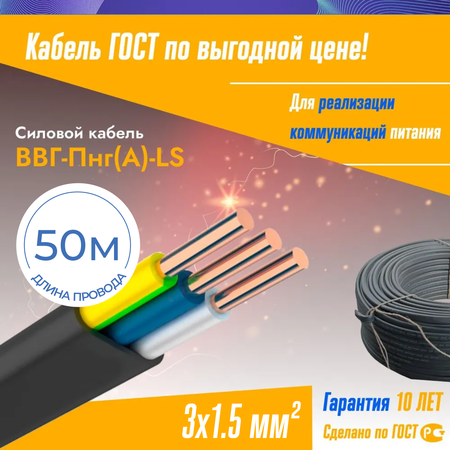 Кабель ВВГ-Пнг(А)-LS 3х1.5 50м - это трехжильный силовой кабель, предназначенный для стационарной прокладки в жилых и нежилых помещениях. Он выполнен из медных однопроволочных жил с изоляцией и оболочкой из ПВХ-композиции пониженной пожароопасности с низким дымо- газовыделением. Благодаря этому, кабель не распространяет горение при групповой прокладке и предназначен для наружного и внутреннего применения. Кабель ВВГ-Пнг(А)-LS 3х1.5 50м произведен в соответствии с ГОСТ 31996-2012, ГОСТ 22483-2012, ГОСТ 31565-2012, что гарантирует его высокое качество и надежность. Кабель имеет следующие характеристики: - Количество жил: 3.0 - Конструкция жилы: одножильный - Диаметр жилы: 1.38 мм - Материал жилы: медь - Сечение: 1.5 мм - Цвет товара: черный - Материал оболочки: ПВХ пластикат - Наружный диаметр: 10.25 мм - Максимальная температура эксплуатации: 50.0 °C - Минимальная температура эксплуатации: -50.0 °C - Минимальный радиус изгиба: 122.0 мм - Длина: 50.0 м - Максимальная нагрузка: 3.6 А - Максимальное рабочее напряжение: 660.0 В - Диаметр проводника: 1.4 мм - Вес товара: 5250 г Кабель поставляется "на отрез" от заводской бухты, что позволяет выбрать необходимую длину.