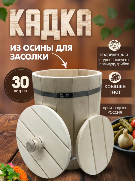 Кадка для засолки с гнетом из осины 27 -30 л, идеально подходит для засолки капусты, огурцов, грибов и других овощей, а также для приготовления квашеной капусты и мочения яблок. Эта кадка для засолки станет вашим незаменимым помощником в создании вкуснейших солений, квашений и мочений. Обращаем ваше внимание: Кадки собираются бондарем вручную, поэтому фактический объем изделий может варьироваться в указанных пределах. Эта кадка с гнетом для засолки изготовлена из экологически чистой осины, которая издавна славится своими уникальными свойствами. Осина – одно из лучших деревьев для изготовления посуды для засолки. В отличие от других материалов, кадка из осины не придает продуктам посторонних запахов и вкусов, а наоборот, обогащает их неповторимым ароматом. Преимущества осиновой кадки для засолки: Натуральность и качество: Кадка из осины предназначена для засолки овощей, грибов, рыбы, приготовления квашеной капусты. Она позволяет сделать натуральные и качественные продукты, без добавления вредных консервантов и искусственных добавок. Долговечность и свежесть: В осиновой древесине содержатся особые вещества, которые являются природными антисептиками. Благодаря этому, соленья долго остаются свежими и не портятся. Универсальность: Эта бочка для засолки идеально подходит для засолки огурцов, помидоров, грибов, для закваски капусты и мочения яблок. Она также отлично подходит для хранения сыпучих продуктов, таких как зерно и мука, меда, воды, замешивания теста и т. д. Широкий спектр применения: Подходит для засолки любых овощей (помидор, огурцов, капусты), грибов, мяса, сала, рыбы, квашеной тыквы, слив, моченых яблок и т. д. Овощи и фрукты, приготовленные в кадке, получаются очень сочными. Польза для здоровья: Приготовленные в осиновой кадке продукты не содержат консервантов, стабилизаторов, красителей, усилителей вкуса и других пищевых добавок, они богаты витаминами и минералами. Себестоимость домашних солений в разы дешевле магазинного товара. Удобство использования: В комплекте с емкостью идет деревянный гнет, на который устанавливается груз чтобы продукты лучше просолились. Для засолки потребуется всего несколько ингредиентов, при этом вы можете использовать традиционные рецепты или импровизировать. Экологичность: Кадка для засолки капусты выполнена из натуральной древесины осины, которая произрастает в экологически чистых районах. Долговечность: Древесина осины содержит сок, который является натуральным антисептиком и обладает консервирующими свойствами, благодаря чему продукты хранятся в разы дольше. Надежность: Кадка для засолки огурцов стянута обручами из нержавеющей стали, которые не подвержены коррозии и деформации. Компактность: Благодаря небольшому размеру и вертикальной ориентации у вас не возникнет сложностей с местом хранения емкости. Ее можно поставить как в теплом, так и прохладном помещении (погребе, гараже).