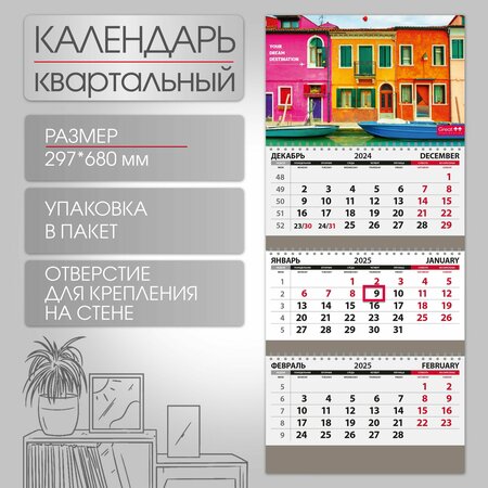 Постер: печать полноцветная, размер 297*195 мм, подложка: печать полноцветная, размер 297*150 мм. Материал картон 230 гр. Блок: печать черно – красная, формат 297*132 мм, установка курсора (бегунок). На постере предусмотрено отверстие для крепления на стену. Упаковка в индивидуальный пакет. Полный размер в развороте 297*680 мм. Пришло время начать планировать свои будущие приключения! Календарь настенный трехблочный серии "Путешествие" станет вашим надежным спутником в этом пути. Календарь трехблочный позволит вам детально планировать и отслеживать важные события в каждом месяце. Благодаря этой функциональности вы никогда не пропустите ни одной даты и сможете эффективно организовать своё время. Календарь на 2025 год из серии "Путешествие" станет прекрасным сувениром. Он стильно впишется в любой интерьер и будет напоминать вам о ваших мечтах и целях. Вы сможете оставить его себе на память или подарить близким, чтобы их 2025 год тоже был наполнен новыми странами, красивыми местами и незабываемыми путешествиями. Не упустите возможность вдохновиться каждый день с календарями серии "Путешествие". Пусть ваш 2025 год будет наполнен новыми странами, красивыми местами и незабываемыми путешествиями!