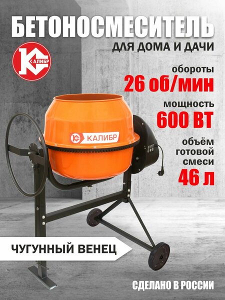 Бетоносмеситель Калибр БСЭ-120 — надежный помощник для масштабных строительных и ремонтных работ. Благодаря вместительному 120-литровому барабану и высокой производительности (до 46 литров готового раствора за цикл), он отлично справляется с приготовлением бетонных смесей с наполнителями до 30 мм, а также с другими видами растворов, включая смеси из сухих компонентов. Электродвигатель мощностью 600 Вт обеспечивает стабильную работу и плавное перемешивание со скоростью до 26 оборотов в минуту. Усиленная венцовая конструкция из чугуна делает механизм прочным и износостойким, а наличие защиты двигателя продлевает срок службы агрегата при интенсивной эксплуатации. Модель оснащена ручным приводом наклона для удобного опорожнения, большими колесами и эргономичной рукояткой для легкого перемещения по площадке. Антикоррозийное покрытие защищает рабочие элементы от неблагоприятных погодных условий, а подключение к обычной электросети (230 В) делает бетоносмеситель универсальным и готовым к использованию на любых объектах. Калибр БСЭ-120 — это сочетание мощности, надежности и удобства, подходящее как для профессионалов, так и для частных застройщиков
