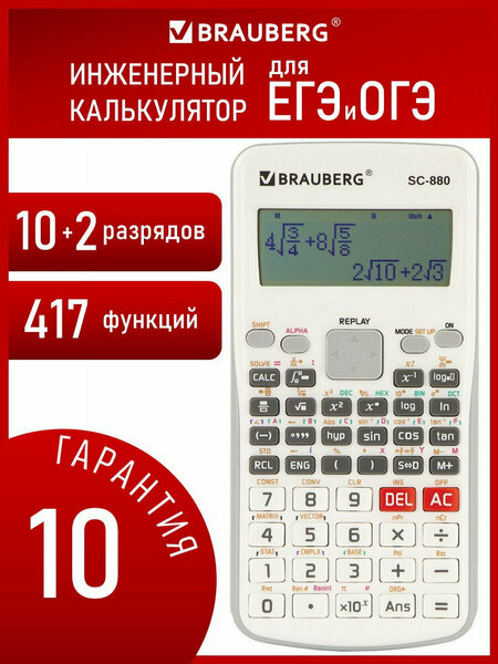 Инженерный калькулятор BRAUBERG SC-880-N – оптимальный выбор для школьников и студентов. Этот калькулятор великолепно справится с выполнением всех основных и сложных вычислений, необходимых на экзаменах и контрольных работах. Сертифицированный для ЕГЭ и ОГЭ по физике, химии, географии и биологии, он предоставляет 417 функций, включая степени, корни, логарифмы, интегралы и дифференциалы. Удобный интерфейс и возможность использования естественного ввода/вывода математических выражений минимизируют ошибки при расчетах. Калькулятор поддерживает работу в двоичной, восьмеричной и шестнадцатеричной системах, что делает его незаменимым для сложных вычислений. Кроме того, он оснащен 40 командами для перевода значений и 40 научными константами, что значительно упрощает работу. Компактные размеры (165х84 мм) и прочный пластик кнопок делают его удобным и долговечным. Функция автоматического отключения продлевает срок службы батареи. Этот мини калькулятор станет вашим надежным помощником. Такой маленький, но мощный калькулятор идеально вписывается в набор офисных принадлежностей и канцелярии для офиса или школы. Гарантия 10 лет подтверждает его высокое качество и надежность. • Разрядность дисплея: 12. • Тип дисплея: жидкокристаллический. • Количество функций: 417. • Функционал: алгебраический ввод/вывод данных (S.V.P.A.M.), вычисление абсолютного значения, вычисления с комплексными числами, матрицами и векторами, генерирование случайных чисел, естественный ввод/вывод данных (N.V.P.A.M.), логические операции, построение таблиц значений функций, расчеты в нескольких системах исчисления, регрессионный анализ, редактор данных с последовательным просмотром, решение систем линейных уравнений, статистические расчеты одной переменной, суммирование, численное интегрирование и дифференцирование. • сертифицирован для ЕГЭ: да. • Число строк дисплея: 2. • Тип калькулятора: инженерный. • Серия: SC. • Регулировка контрастности дисплея: да. • Конструктивные особенности: сдвижной пластиковый футляр. • Тип питания: 1 батарейка CR2032. • Цвет панели: белый. • Длина корпуса: 165 мм. • Ширина корпуса: 84 мм. • Вес: 130 г. • Упаковка: картонная коробка с европодвесом. • Артикул производителя: 250526.