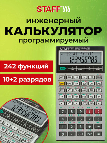 Инженерный калькулятор STAFF STF-169 — идеальное решение для студентов и школьников, нуждающихся в надежном помощнике для занятий по физике, химии и другим наукам. С размерами 143х78 мм, этот калькулятор маленький и удобный для переноски, что делает его незаменимым в рюкзаке и на столе. Несмотря на свои компактные размеры, он обладает 242 функциями, включая статистические и тригонометрические расчеты, что позволяет легко справляться с любыми задачами. Большой двустрочный дисплей обеспечивает удобство при отображении вычислений и результатов, что особенно важно для изучения сложных тем. Калькулятор имеет память для одной пользовательской формулы и поддерживает различные системы исчисления, что делает его универсальным инструментом. Благодаря встроенному аккумулятору, STAFF STF-169 предлагает длительное время работы, что особенно удобно для использования в офисе или на уроках. Этот мини калькулятор станет отличным дополнением к вашим офисным принадлежностям и канцелярии для офиса, обеспечивая высокую эффективность и точность расчетов. Выбирая STAFF STF-169, вы получаете надежного помощника, который облегчит учебу и работу, превращая сложные вычисления в простые и доступные задачи. • Разрядность дисплея: 10. • Тип дисплея: жидкокристаллический. • Количество функций: 242. • Число строк дисплея: 2. • Тип калькулятора: инженерный. • Серия: Scientific. • Металлическая панель: да. • Тип питания: 1 батарейка CR2025. • Цвет панели: серебристый. • Длина корпуса: 143 мм. • Ширина корпуса: 78 мм. • Вес: 165 г. • Упаковка: картонная коробка с европодвесом. • Гарантия: 12 мес. • Артикул производителя: 250138.