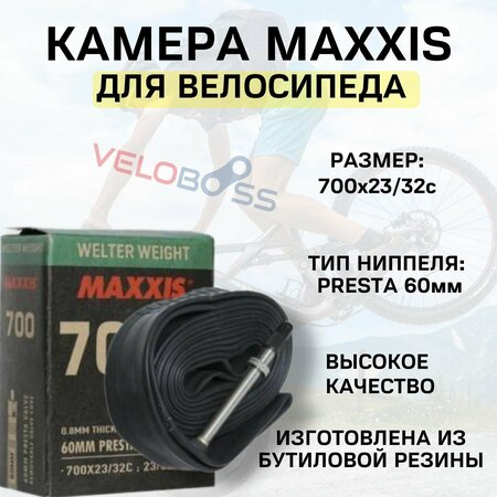 Размер: для колес 28 дюймов (700C) с шириной покрышки от 23 мм до 32 мм (23/32c). Толщина стенки: 0.8 мм (серия Welter Weight). Камера среднего веса для всех видов велосипедов, устойчивая к проколам. Тип ниппеля: Presta (велониппель) длина 48 мм. Съемный клапан ниппеля. Велокамера поставляется в индивидуальной упаковке. Низкий вес камеры Maxxis Welter Weight отлично подходит для занятий велоспортом, камеру удобно брать с собой в поездку как запасную.