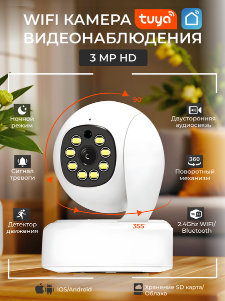 Умная WiFi IP-камера видеонаблюдения 3 МП с функцией слежения, поворотным механизмом, сиреной и LED-подсветкой – надёжная охрана вашего дома. Компактная, но функциональная WiFi-камера видеонаблюдения на платформе Tuya Smart / Smart Life — это удобное решение для безопасности дома, квартиры, офиса, детской или склада. Подключается к Wi-Fi и управляется через приложение с любого устройства (iOS, Android). Основные функции и преимущества: ✔️ Разрешение 3 МП — чёткая и детализированная картинка с хорошей цветопередачей. ✔️ Поворотный механизм 355° по горизонтали / 90° по вертикали — полный обзор помещения без слепых зон. ✔️ Функция распознавания и отслеживания движения — камера автоматически поворачивается за движущимся объектом. ✔️ LED-подсветка и ночное видение — отличное изображение в темноте. ✔️ Встроенная сирена — громкий сигнал при срабатывании датчика движения или звука (управляется через приложение). ✔️ Моментальные push-уведомления — камера реагирует на движение или шум и сразу отправляет оповещение на телефон. ✔️ Двусторонняя аудиосвязь — встроенный микрофон и динамик позволяют слушать и говорить через камеру. Важно! Кнопка обратного вызова на корпусе камеры в данной модели неактивна и декоративна. ✔️ Запись на карту памяти microSD (до 128 ГБ) — надёжное локальное хранение видео (карта приобретается отдельно). ✔️ Поддержка облачного хранения — сохранение архива в защищённом облаке (опционально, по подписке). ✔️ Интеграция с умным домом Tuya Smart — управление другими устройствами, создание сценариев, автоматизация. ️ Важная информация: Поддерживается только Wi-Fi 2.4 GHz (5 GHz не работает). ️ Простая и быстрая настройка — займёт не более 2 минут. Инструкция внутри упаковки и в карточке товара. Приложение Tuya Smart (или Smart Life) — на русском языке, бесплатно в App Store и Google Play. Настраивайте сценарии, выбирайте режимы записи, делитесь доступом с другими пользователями — всё в одном удобном приложении. Камера легко адаптируется под любые задачи безопасности в доме.