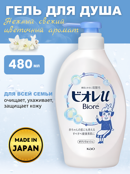 KAO Жидкое мыло для тела Biore U Pump Type гель для душа мягкая свежесть, с освежающим ароматов цветов, 480мл.