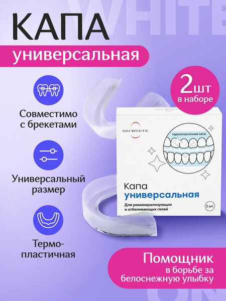 Ищите надёжную капу для использования с отбеливающим гелем? Хотите защитить зубы от преждевременного смывания реминерализующих составов? Необходимо лечение зубов аппликативного характера различными аптечными средствами? «On White» предлагает простое и бюджетное решение – Термопластичная Капа для зубов. Усильте действие любого состава – наденьте капу и, таким образом, увеличьте время воздействия. Слюна и напитки не смогут добраться до ваших зубов и помешать процессу. Капа, приняв форму вашего зубного ряда, поможет любому средству эффективнее проникать в эмаль, и, параллельно, защитит слизистые ткани полости рта от агрессивных компонентов, если таковые имеются. Отбеливайте зубы с комфортом, без проблем восстанавливайте эмаль, проводите действенное лечение парадонтоза и других заболеваний. Термопластичная каппа формируется под ваш индивидуальный зубной ряд, обеспечивает максимальный контакт с эмалью и предназначена для: • домашнего отбеливания зубов • проведения курса реминерализации эмали • сеансов фторирования эмали * Капа используется, как вспомогательный инструмент для повышения эффективности специализированных гелей Грамотный уход за зубами с ON WHITE!