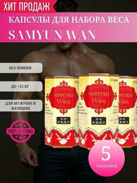 {"widgets":{"@market/Ecommerce":{"/content/page/fancyPage/defaultPage/commonEcommerce/ecommerce":{"env":"production","commonParams":{"pageType":"other","pageId":"market:product-osku","siteType":"desktop","userId":"4148ce62e2d391ed695095db8a3400b193539883d1c26a9e6d20ec34632f9bd8","regionId":10335},"pageSpecificParams":[{"ecommerce":{"detail":{"products":[{"id":"1242189604","name":"Капсулы для набора веса и мышечной массы гейнер SAMYUN WAN 100 капсул 5 банок","brand":"California Gold Nutrition","categoryId":18072229,"hid":15825980,"vendorId":14116958,"price":422284,"oldPrice":1500000}]}},"event":"PRODUCT_VIEW"}],"dataLayerOptions":{"isDebugMode":false,"srcIframe":"//yastatic.net/s3/market-b2c-export-static/uz/gtag.html?pageType=other&pageId=market%3Aproduct-osku&siteType=desktop"}}}},"meta":{"/content/page/fancyPage/defaultPage/commonEcommerce/ecommerce":{"name":"@market/Ecommerce"}},"collections":{"ecommerce":{"2573717337187501089":{"id":"1242189604","name":"Капсулы для набора веса и мышечной массы гейнер SAMYUN WAN 100 капсул 5 банок","categoryId":18072229,"hid":15825980,"vendorId":14116958,"price":422284,"currency":"UZS","oldPrice":1500000,"productId":"1242189604","productTitle":"Samyun Wan, 20 капсул Натуральная добавка для набора массы и укрепления организма","brand":"California Gold Nutrition","category":"Препараты для укрепления связок и суставов для спортсменов"}}}}
