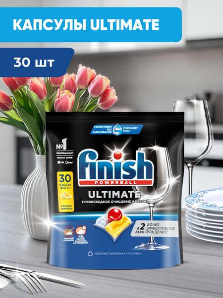 Капсулы для посудомоечных машин Finish Ultimate с ароматом Лимон бесфосфатные, 30 шт, таблетки Финиш для посудомойки
