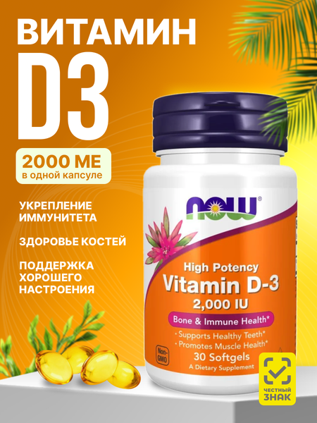 Витамин Д3 2000 МЕ капсулы NOW для иммунитета. Высококачественный витамин Д3 для иммунитета, похудения, крепких костей и здоровья всей семьи. Мощная формула 2000 МЕ (50 мкг) витамина D3 (холекальциферола) от американского бренда NOW Foods для женщин, мужчин и взрослых. Восполняет дефицит, укрепляет иммунитет, защищает от гриппа и простуд, поддерживает здоровье костей и помогает поддерживать здоровье при похудении. Дозировка 2000 МЕ - оптимальная концентрация для поддержания нормального уровня витамина D. Мягкие гелевые капсулы с масляной основой для лучшего усвоения. Укрепляет иммунную защиту организма от простуды и гриппа. Способствует нормализации веса и метаболизма. Поддержка гормонального баланса и здоровья. Укрепление костной системы и профилактика остеопороза. Показания к применению:- Профилактика и лечение дефицита витамина D3 у взрослых;- Укрепление иммунитета против гриппа и простудных заболеваний;- Поддержка программ похудения и контроля веса;- Для здоровья женщин: гормональный баланс, красота волос и ногтей;- Для крепости костей и профилактики остеопороза;- Для детей старшего возраста (после консультации с врачом);- При повышенном риске сердечно-сосудистых заболеваний;- Для улучшения настроения и борьбы с сезонной осенней и зимней депрессией. Особенности:- Высокая биодоступность благодаря форме мягких гелевых капсул;- Масляная основа для оптимального усвоения жирорастворимого витамина D;- Без глютена и ГМО;- Строгий контроль качества. Способ применения: Принимайте по 1 мягкой гелевой капсуле в день во время еды или по рекомендации врача. Для детей - только после консультации с педиатром. Кому подойдет:- Взрослым с диагностированным дефицитом витамина D;- Жителям регионов с малым количеством солнечных дней;- Для укрепления иммунитета против простуд и гриппа;- Женщинам для поддержки здоровья и гормонального фона;- При программах похудения и контроля веса;- Детям старшего возраста (по назначению врача);- Спортсменам для поддержки мышечной функции;- Пожилым людям для профилактики остеопороза. NOW Foods, витамин Д3 2000 МЕ, витамин D3 2000 IU, холекальциферол 2000 МЕ, мягкие гелевые капсулы, softgels, иммунитет поддержка, иммунной системы укрепление, иммунитета укрепление, кости укрепление, здоровье костей, зубы здоровье, дефицит витамина Д, витамин Д для взрослых, стандартная дозировка, витамин Д3 масляный, биодоступный витамин Д, добавка витамин D3, витамин Д3 премиум, американский витамин Д, NOW Vitamin D3, витамин Д3 2000 МЕ купить, витамин Д3 2000 отзывы, витамин Д для похудения, витамин D3 для контроля веса, витамин Д для метаболизма, витамин Д для женщин, витамин Д при гормональном сбое, витамин Д для красоты, витамин Д для волос и ногтей, витамин Д от простуды, витамин Д от гриппа, витамин Д для иммунитета детям, витамин Д для подростков, витамин Д для ребенка, витамин Д при простуде, витамин Д для профилактики ОРВИ, витамин Д при гриппе, витамин Д для всей семьи, витамин Д при остеопорозе, витамин Д для костей детям, витамин Д для пожилых, кальциево-фосфорный обмен, рост мышечных клеток, нормализация уровня глюкозы, рост нервных клеток, восполняет дефицит, масляная форма, биодоступность, активная жизнь, сердечно-сосудистая система, нормализация сна, улучшение памяти, для пожилых, при ОРВИ и простуде, профилактическая дозировка, витамин Д3 2000 МЕ NOW, daily dose, витамин D3 2000 