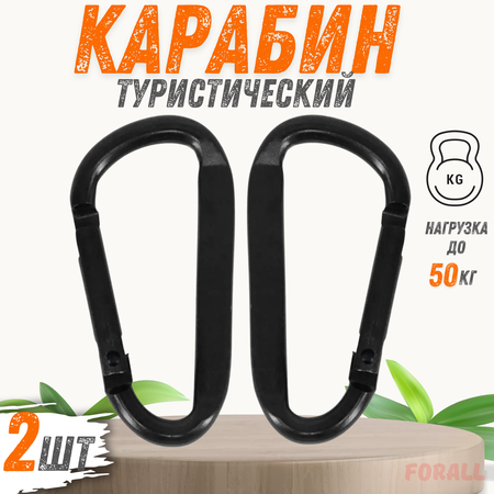 Карабин типа D из алюминиевого сплава ForAll, черный, 2 шт. Материал и конструкция: Карабин ForAll изготовлен из высококачественного алюминиевого сплава, что обеспечивает его исключительную прочность и долговечность. Черный цвет придает карабину стильный и современный вид, который будет отлично сочетаться с любым снаряжением.