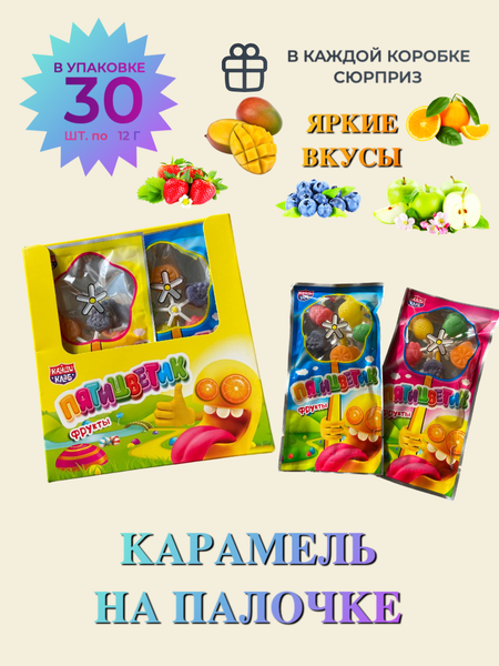 Леденцовая карамель на палочке "Пятицветик" в форме цветочка- лакомство, любимое детьми и взрослыми разных поколений. Такая сладость привлекает не только своей формой и незабываемым вкусом, но интересной возможностью поиграть и устроить незабываемую вечеринку. Конфета на палочке "Пятицветик" в индивидуальной упаковке, поэтому его можно взять с собой на прогулку, в гости, в детский сад или школу. Яркие и вкусные конфеты, насыщенный сочный вкус и интересный дизайн сделают ваш праздник ярче, перекус вкуснее, детей счастливее и никого не оставят равнодушным. Конфета на палочке в форме цветочка из пяти лепестков - это прекрасный подарок для любого праздника. Продается блоком со вложением 30 штук, вес каждого леденца 12 грамм. Внимание! Может поставляться в двух разных коробках в ассортименте: желтая (клубника, яблоко, апельсин, виноград, голубика) или голубая ( клубника, арбуз, голубика, манго, ананас). Рекомендуется детям от 3-х лет. Хранить при температуре не выше 21 градуса цельсия и относительной влажности воздуха не более 75%