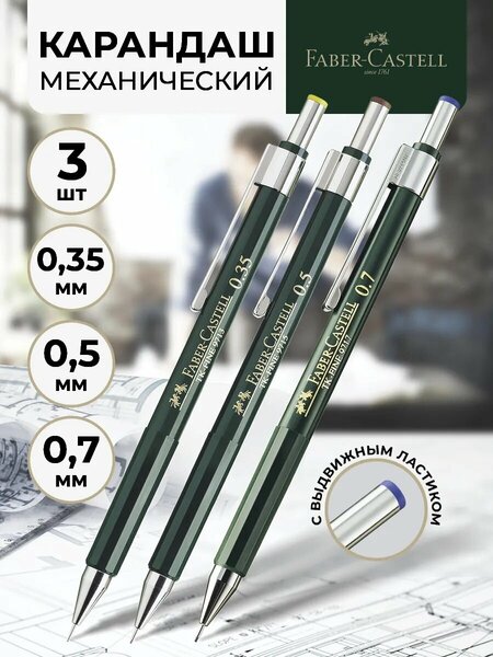Механические карандаши "TK-Fine 97" легендарного немецкого производителя Faber-Castell – незаменимый инструмент для черчения, рисования и письма. В наборе три автоматических чернографитных карандаша с твердостью грифеля HB разных диаметров: 0,35, 0,5 и 0,7 мм. Их легко различить благодаря цветовому индикатору на кнопке. Упакованы в пластиковый кошель для хранения. Прочная металлическая направляющая обеспечивает точное и плавное движение. Поэтому механические карандаши идеальны для работы с линейками и трафаретами. А ещё они позволяют создавать детализированные рисунки и аккуратные записи. Подходят как для профессионалов, так и для студентов. Полностью убирающаяся направляющая гарантирует безопасность – удобно транспортировать и носить в карманах. Выдвижной ластик встроен в торцевую часть. Он мягко и эффективно стирает следы и не оставляет разводов. Не содержит ПВХ. Автоматические карандаши серии "TK-Fine" выполнены в фирменном тёмно-зеленом цвете бренда с серебристыми деталями из металла. Это делает их не только функциональными, но и стильными. Произведено в Германии.
