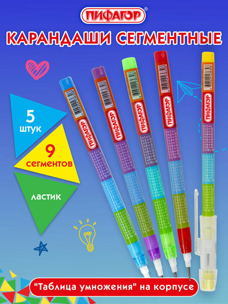 Сегментный карандаш ПИФАГОР "Таблица умножения" - идеальный инструмент для школьных занятий и детского творчества. Этот карандаш простой удобен в обращении, оснащён 9 сменными стержнями, что делает его отличным выбором для уроков, где требуется постоянная готовность к рисованию и письму. Благодаря твердости HB и наличию ластика, ваши записи механическим карандашом всегда будут аккуратными. Комплект из 5 штук представлен в пластиковом корпусе ассорти, что добавляет в вашу канцелярия разнообразие и стиль. Эти механические карандаши подойдут как для рисования, так и для выполнения домашних заданий. Если вы ищете милую канцелярия для школы, этот набор простых карандашей станет отличным выбором для юных художников и студентов. Эффективно сочетая функциональность и яркий дизайн, сегментные карандаши ПИФАГОР помогут вдохнуть жизнь в ваши творческие проекты и сделать обучение увлекательным! Представляем широкий выбор канцелярских принадлежностей, которые станут незаменимыми помощниками как для школьников, так и для офисных сотрудников. Милая канцелярия, оформленная в ярких и привлекательных дизайнах, понравится и девочкам, и мальчикам. Обратите внимание на простые карандаши для ежедневных записей и заметок, а также специализированные письменные принадлежности - механические и сегментные карандаши. Особенностью сегментного карандаша является встроенная таблица умножения, что делает его не только практичным инструментом для рисования и письма, но и полезным учебным пособием. Автоматический карандаш обеспечит четкость и точность линий. Набор из механического карандаша с грифелями идеально подойдет для ежедневного использования. А секционные карандаши с ластиком легко исправят ошибки, делая процесс обучения и работы максимально комфортным. Будь то подготовка к школьным занятиям или выполнение офисных задач, наша канцелярия станет надежным инструментом для достижения лучших результатов. • Тип карандаша: сегментный. • Диаметр грифеля: 1,6 мм. • Наличие ластика: да. • Твердость грифеля: НВ. • Форма корпуса: круглая. • Серия: Таблица умножения. • Запасные грифели в комплекте: 9 шт. • Материал корпуса: пластик. • Материал клипа: пластик. • Цвет корпуса: ассорти. • Упаковка: картонная коробка. • Артикул производителя: 881022.