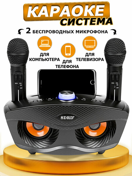 Наше музыкальное устройство – это 2 в 1: bluetooth колонка и радио микрофоны! С помощью караоке станции для дома можно петь любые песни, будь то хиты прошлых лет или современные композиции. Не требует особой подготовки или обучения, достаточно просто включить, подсоединить по блютуз ваш девайс, выбрать на нем песню. Комплектация включает два беспроводных микрофона с регулировками громкости и эхо. Два динамика суммарной мощностью 20Вт обеспечат чистым громким звучанием. Подключить систему по блютуз возможно к смартфону, планшету, компьютеру. К телевизору при помощи AUX кабеля, необходимо включить режим AUX кнопкой MODE. Запускайте музыку с USB флэшки или карты памяти microSD. Классно использовать на вечеринках и других мероприятиях. Берите с собой на природу, в гости или на отдых. Встроенного аккумулятора хватит до 5 часов непрерывной работы. Домашнее караоке для телевизора поможет улучшить вокальные навыки, научиться правильно дышать, произносить звуки, развить голос и музыкальный слух. Пойте любимые песни вдвоем, используйте акустическую систему как громкую беспроводную колонку. Вы можете приглушить оригинальный вокал в фонограмме и тогда Ваш голос выйдет на передний план. Станет дополнением для Вашей веселой компании, сочетает в себе забаву и практичность. Будет отличным подарком для любого меломана на праздник день рождения девочке маме подруге женщине коллеге. Модель подходит для детей и взрослых.