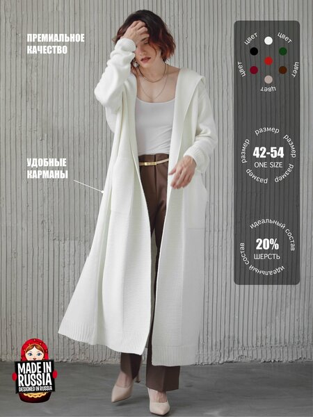 Кардиган с капюшоном и карманами благородного белого (млочного) цвета станет настоящим трендом сезона 2024/2025. Он длинный, мягкий и классический, что делает его идеальным выбором для повседневной носки. Натуральная шерсть в составе обеспечивает комфорт и тепло, а акрил придает изделию яркий внешний вид и долговечность. Этот удлиненный кардиган длиной 126 см можно удобно сочетать с пальто или курткой, а также использовать в качестве стильной накидки или как уютный домашний халат. Фасон оверсайз и плюс сайз (plus size) в комбинации с объемными рукавами делают эту модель выразительной и невероятно женственной. Она будет прекрасно смотреться как на девушках, так и на женщинах. Однако благодаря своему классическому стилю, кардиган (вязаное пальто) также подходит для мужчин. Прямой крой без застежек делает его универсальным: он отлично подходит для разных типов фигур, включая людей больших и стройных размеров, а также для высоких и невысоких. Этот кардиган станет отличным решением для кормящих матерей, будущих мам и даже невест на свадьбе, так как его можно легко комбинировать с свадебными платьями. Кроме того, он хорошо впишется в офисный гардероб и будет уместен как для учебы, так и для вечерних мероприятий. Изготовленный из современного премиум материала, кардиган не теряет формы и не подвергается деформации, что подразумевает долгий срок службы при правильном уходе. А в летние вечера эта накидка станет отличным вариантом для утепления в прохладную погоду.