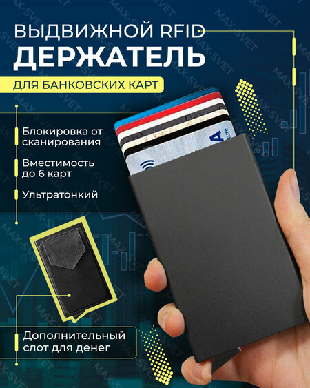Выдвижная алюминиевая визитница F-MAX - стильный и практичный способ хранить все банковские карты, визитки, проездные и пропуски в одном месте. Картхолдер выполнен из прочного алюминия - она не деформируется от ударов, падений и перепадов температур, сохраняет свой внешний вид на долгое время и обеспечивает защиту кредитных карточек от сканирования благодаря RFID технологии. Футляр легко закрывается и открывается при помощи специальной застежки защелки, а благодаря компактному размеру 10х7х1 см его легко носить в кармане одежду или сумки. Кошелек вмещает в себя до 6-8 пластиковых карт, для каждой из которых внутри кредитницы предусмотрено отдельное место. В каталоге представлено большое количество кард холдеров из металла разных расцветок - вы можете подобрать карточницы в подарок мужчинам и женщинам, а также приобрести себе кейс любимого цвета. Креативный и модный дизайн оценят все любители оригинальных и красивых аксессуаров. Выбирайте мужской или женский чехол под карточки и храните свои платежные средства в полном порядке! Это отличный выбор для поездок и путешествий, а также для повседневного использования - с нашим карточником вы забудете о потерянных картах или забытых проездных!