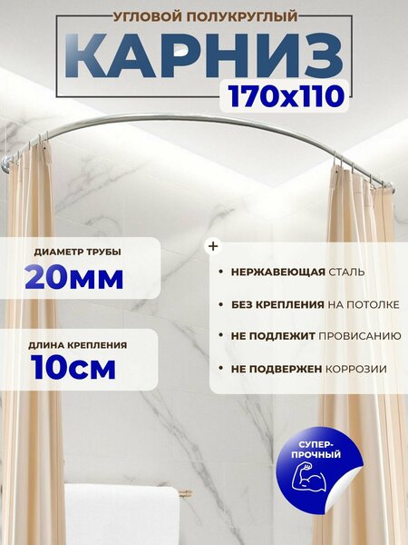 Представляем угловой карниз Дуга для ванной! Этот стильный и практичный элемент интерьера идеально подходит для создания комфортного пространства и эффективного использования углов в ванной комнате. Размеры карниза составляют 170 x 110 см, что делает его идеальным решением для помещений различных размеров. Его конструкция позволяет установить штору в углу, максимально используя доступное пространство. Изготовленный из хромированной нержавеющей стали, данный карниз отличается высокой прочностью и долговечностью. Он не только обеспечивает надежную поддержку для штор, но и создает современный и элегантный вид в вашем интерьере. Штанга толщиной 20 мм придает карнизу дополнительную устойчивость, что гарантирует отсутствие провисания даже под тяжестью штор. Крепление длиной 10 см обеспечивает легкую установку и надежное закрепление карниза, что делает его использование максимально удобным. Вы сможете легко повесить шторы и создать гармоничный и уютный интерьер вашей ванной комнаты, обеспечив себе комфорт во время водных процедур. Карниз угловой усиленный – отличный выбор для тех, кто ищет стильное и функциональное решение для организации пространства в ванной комнате. Легкий уход и устойчивость к влаге делают его идеальным вариантом для использования именно в таких помещениях. Установив карниз, вы сможете легко менять шторы под настроение или сезон, а также создавать уникальные дизайнерские решения без особых усилий. Если вы стремитесь к совершенству и желаете сделать свою ванную комнату более удобной и стильной, полукруглый карниз усиленный станет отличным дополнением.
