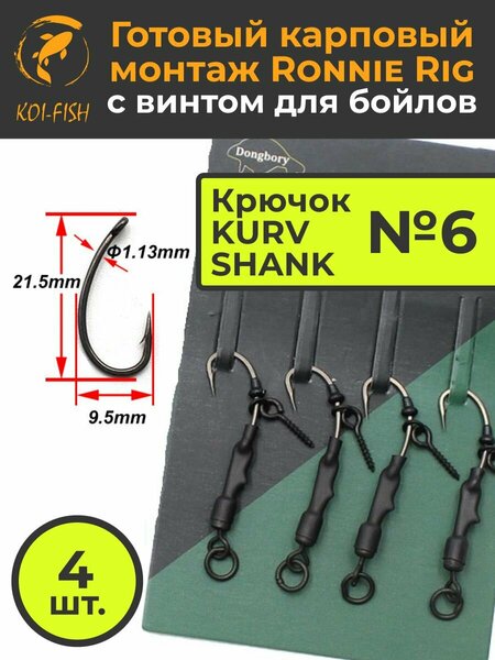 Крючки карповые RONNIE RIG №6 (в наборе 4шт) (один из самых популярных монтажей для ловли карпа) на базе крючка Kurve Shank / Ronnie Rig / Крючок карповый / Крючки рыболовные / карпфишинг / Крючки на карпа / крючки для ловли карпа / крючки карповые представляет Вам готовый монтаж RONNIE RIG, изготовленный на базе крючка Kurve Shank. Это один из самых популярных монтажей для ловли карпа на поп-ап. Крючки изготовлены из высокоуглеродистой стали по уникальной инновационной технологии. Эта технология увеличивает предел прочности и высокое сопротивление коррозии. Острота крючка достигается особым химическим процессом обработки (Aero Point), который делает заточку жала совершенным и формирует концентрическое острие. Таким образом, острие крючка становится сверхострым и сверхпрочным.