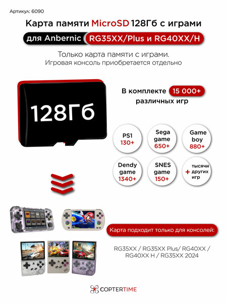 Только карта памяти с играми Игровую консоль нужно приобретать отдельно. Обратите внимание, что это не загрузочная флешка, а дополнительная с играми. Совместимость: Карта подходит только для консолей: - RG35XX 2022 - RG 35XX 2024 - RG35XX Plus - RG 40XXV - RG 40XXH Есть ли русские игры? Да некоторые популярные игры имеют перевод на русский язык и обычно имеют после названия слова RUS / Russia. Как использовать? 1. Полностью выключите консоль 2. Вставьте карту памяти в слот TF2/Ext 3. Включите консоль 4. При переходе в раздел игры в меню появится выбор карты с которой запускать игры. Выберите TF2/Ext. Комплектация Карта памяти MicroSD с 15000+ играми