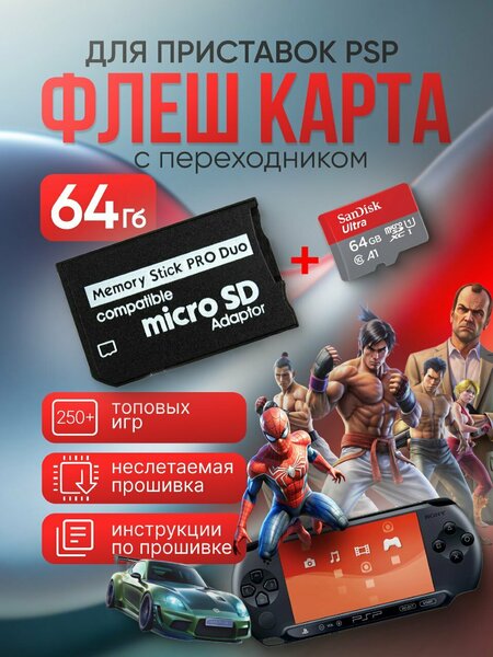 Внимание! Игры работают только на прошитой консоли. Все манипуляции с приставкой Вы делаете на свой страх и риск. Инструкция и прошивка находятся на флешке. При необходимости прошивки, подключите флешку к компьютеру или ноутбук и ознакомьтесь с инструкциями. На флешке есть все необходимые файлы и видео для прошивки. Если по каким-либо причинам у Вас не получается прошить консоль, то напишите в чат продавца, мы обязательно поможем. Так же имеется полно информации в свободном доступе. Введите в поисковую строку фразу "неслетаемая прошивка для psp". Флешка высокого качества и высокой скоростью передачи данных. При подключении Вам будет доступно больше 250 игр. Из них 50 игр psp, более 100 игр денди и 100 игр сега. Данная флешка подходит для консолей psp 1000-1008, 2000-2008, 3000-3008, psp e1000-e1008 (street). Внимание! Не подходит для psp go и psp vita.
