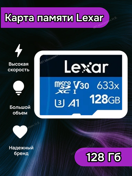 Ultra High Speed micro SDXC карта памяти Lexar является идеальным решением для хранения цифровой информации в электронных устройствах (телефоны, планшеты, фотоаппараты). Memory card обеспечивает скорость чтения до 100 МБ /с (Фактическая скорость тестирования зависит от уровня кард-ридера или компьютера Скорость записи данной карты памяти 45 Мб/с. Это скоростная микро флешка с 10 классом скорости (Class 10 UHS-I U1) Флеш карточка имеет на 128 Гб имеет рабочий объём 115ГБ-120 ГБ ( остальной объём необходим на внутренние ресурсы) Карта памяти - это отличный флеш накопитель для домашнего и рабочего использования.
