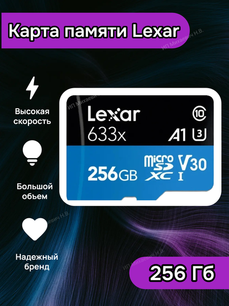 Карта памяти Lexar MicroSD 256 Гб — идеальное решение для расширения памяти вашего смартфона, планшета, экшн-камеры, навигатора, дрона, игровой приставки Nintendo Switch. Внимание! Вместимость флеш накопителя всегда меньше заявленной, например 256 ГБ = примерно 230-238 ГБ (Это разница в расчетах между производителем (1 ГБ = 1000 МБ) и нашим ПК (1 ГБ = 1024 МБ).) Скорость чтения данных флешки до 100 Мб/с и скорость записи 45 Мб/с обеспечивают быстрый доступ к вашим файлам и плавную работу приложений. Микро флешка для телефона Лексар MicroSD 256 обеспечит 24 часа непрерывной записи без задержек. Она также позволит быстро снимать, воспроизводить и передавать видео 1080pand 4K. Флешка 256 GB - отличный подарок на любой праздник.