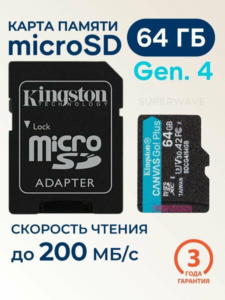 Карта памяти micro SD Kingston с артикулом SDCG4/64GB — это сменный носитель информации объёмом 64 ГБ. Тип товара — карта памяти. Модель подходит для хранения и передачи данных, записи видео и фото, использования в портативных устройствах и цифровой технике. Актуальна в тех случаях, когда требуется карта памяти micro sd 64gb или флешка микро сд для записи большого объёма данных. Карта выполнена в формате micro sd, обеспечивая совместимость с большинством современных устройств. Может использоваться как микро сд карта памяти микро сд карта памяти 64 гб в смартфонах, регистраторах и камерах. Обладает высокой надёжностью при длительной эксплуатации. Решение подойдёт как карта памяти для камеры видеонаблюдения, а также как карта памяти для экшн камеры и карта памяти для видеорегистратора. Может использоваться как карта памяти для телефона или карта памяти для go pro, включая модели, поддерживающие карты объёмом 64 ГБ. Модель подходит в качестве карта памяти для уличной камеры, карта памяти для домофона и карта памяти для фотоловушки, где важны устойчивость к температуре и стабильность записи. Также применяется как карта памяти для регистратора и карта памяти для вай-фай камеры. Подходит как карта памяти для видеоглазка, карта памяти для уличной видеокамеры и карта памяти для детского фотоаппарата. Может использоваться как карта памяти для psp, карта памяти для электронной книги или карта памяти для nintendo switch. Карты памяти Canvas Go! Plus microSD от Kingston предназначены для любителей приключений и мобильных геймеров, требующих высокую производительность, где бы они не находились. Благодаря молниеносной скорости передачи данных до 200 МБ/с они оптимизируют ваш рабочий процесс, позволяя посвятить больше времени съемке и созданию контента. Классы скорости U3 и V30, оптимизированные для экшн-камер и дронов, позволяют снимать потрясающие видео в формате 4K Ultra-HD даже в динамичных сценариях. Независимо от того, ведете ли вы съемку экстремальных видов спорта или захватывающую аэрофотосъемку, карта памяти Canvas Go! Plus обеспечивает надежную работу без задержек. Для любителей мобильных игр класс производительности приложений A2 обеспечивает более быстрое время загрузки приложений и беспрепятственный игровой процесс на смартфонах и планшетах. Забудьте о досадных задержках и получайте больше возможностей для улучшения вашего игрового опыта. Дополнительный SD-адаптер для карт памяти Canvas Go! Plus microSD обеспечивает дополнительную универсальность и совместимость с широким спектром устройств, поддерживающих карты формата SD. Карты памяти Canvas Go! Plus microSD 4-ого поколения предназначены для мобильных игр, дронов, экшн-камер и устройств Android. Они могут стать отличным подарком для друзей, родных и коллег Габариты microSDXC карты: 11 x 15 x 1 мм Габариты SD-адаптера: 24 x 32 x 2,1 мм