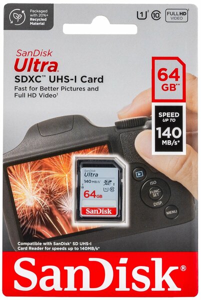 Артикул SDSDUNB-064G-GN6IN Накопитель, который поможет запечатлеть все происходящее вокруг. Снимайте более качественные фото и видео в формате Full HD компактными фотоаппаратами и камерами среднего ценового сегмента. Благодаря емкости до 64 ГБ у Вас будет достаточно пространства для хранения огромного количества фотографий и часов видео с разрешением Full HD Защита от воды, перепадов температур и других факторов. Карты SanDisk Ultra SD обеспечивают высокую скорость и непревзойденное быстродействие при записи видео, чтобы вы успели запечатлеть все важные события. Совместимость с устройством чтения карт памяти SanDisk SD UHS-I Используйте карты с устройством чтения карт памяти SanDisk SD UHS-I для быстрой передачи файлов