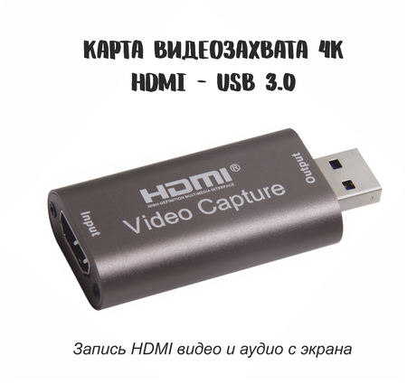 Карта видеозахвата USB 3.0 записывает видео и аудио с разных источников сигнала – видеокамер, вебкамер, ТВ приставок, фотоаппаратов, телевизоров, игровых приставок и других устройств с выходом HDMI. Устройство видеозахвата сделано в компактном и прочном корпусе, а также отличается простотой и удобством использования. Для подключения карта оснащена с одной стороны классическим входом HDMI, а с другой – разъемом USB3.0. Характеристики: Тип источника питание — USB Входные разъёмы на корпусе — HDMI Выходные разъёмы на корпусе — USB 3.0 Максимальная частота кадров — 60 Гц Максимальное разрешение — 3840х2160 Подключение дополнительного питания к адаптеру не требуется. Не требует установки драйверов.