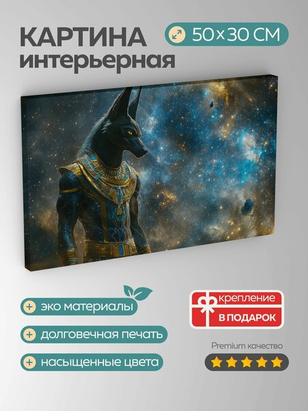 Интерьерная картина размером 50x30 см, прикрасно подойдет для домашнего интерьера. Картина выполнена на синтетическом холсте, который не выцветает на солнце. Подрамник выполнен из сосны - крепкий, экологически чистый материал. Качество сборки препятствует провисанию полотна со временем. Галерейная натяжка будет радовать глаз. Набор аккуратно упакован с применением защитных уголков с комплектом креплений, и полностью готов к монтажу, Вам останется только повесить картины на стену. Цвета картины могут незначительно отличаться из-за освещения и цветопередачи монитора от представленных на изображении. Погрузитесь в мир древнеегипетской мифологии с этим завораживающим цифровым произведением искусства. На фоне звездного неба и мистических символов предстает священный Анубис, бог загробной жизни с головой шакала. Его величественное присутствие наполняет пространство загадочным очарованием, придающим интерьеру уникальный и загадочный шарм.