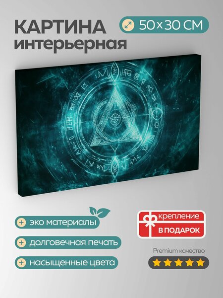 Интерьерная картина размером 50x30 см, прикрасно подойдет для домашнего интерьера. Картина выполнена на синтетическом холсте, который не выцветает на солнце. Подрамник выполнен из сосны - крепкий, экологически чистый материал. Качество сборки препятствует провисанию полотна со временем. Галерейная натяжка будет радовать глаз. Набор аккуратно упакован с применением защитных уголков с комплектом креплений, и полностью готов к монтажу, Вам останется только повесить картины на стену. Цвета картины могут незначительно отличаться из-за освещения и цветопередачи монитора от представленных на изображении. Погрузитесь в мир древних тайн и магии с этой удивительной цифровой иллюстрацией, изображающей древние рунические символы власти, переплетенные с мистическими элементами. Сияющий неземной голубой свет, исходящий от символов, создает ощущение невероятной ауры и таинственности. Иллюстрация выполнена на темном фоне, что придает ей загадочность и мистическую привлекательность. Это произведение искусства погружает зрителя в атмосферу древних загадок и захватывает своей таинственной энергией.