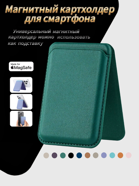 Картхолдер магнитный для смартфона (IPhone) Magsafe с подставкой, вмещает 3 карты, цвет зеленый