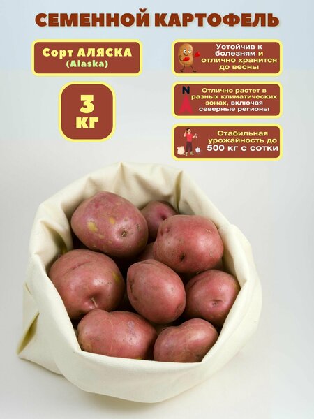 Картофель семенной Аляска, 3 кг. Раннеспелый сорт с высокой урожайностью и устойчивостью к болезням. Подходит для любых регионов и типов почв. Клубни отличаются крупным размером.