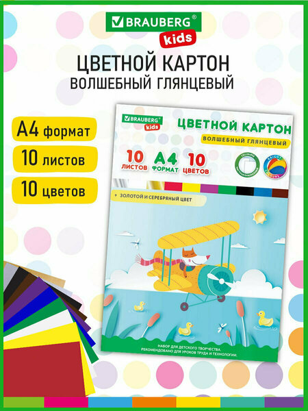 Набор цветного картона BRAUBERG KIDS — идеальный выбор для творчества детей с трехлетнего возраста. Этот цветной картон формата А4 станет отличным дополнением к канцелярским товарам для школы, обеспечивая яркие и насыщенные оттенки благодаря глянцевой поверхности и улучшенной прокраске. В наборе 10 листов плотного мелованного картона, который легко режется, сгибается и клеится, что делает его незаменимым для уроков труда и технологии. Цветной картон BRAUBERG KIDS включает разнообразные оттенки, включая золотой и серебряный, и удобную красочную папку с дополнительным нижним клапаном, предотвращающим выпадение и порчу листов. Создайте уникальные аппликации, следуя творческой инструкции на обороте, и наслаждайтесь процессом. Этот картон станет прекрасным дополнением к вашей канцелярии, обеспечивая долгую яркость и четкость цветовых решений. • Формат: А4. • Количество листов: 10. • Количество цветов: 10. • Тип картона: мелованный, с улучшенной прокраской. • Плотность картона: 200 г/м2. • Тип товара: картон цветной мелованный EXTRA. • Дизайн: Лисенок-пилот. • Длина: 200 мм. • Ширина: 290 мм. • Индивидуальная упаковка: да. • Упаковка: папка. • Артикул производителя: 115157.